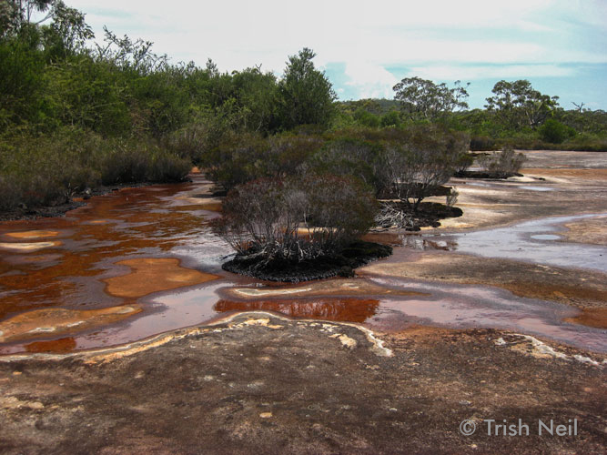 I was wandering through the bush near where I live, looking at some aboriginal rock carvings, and came across these wonderful rock platforms. I lay down on the rock to take the first picture; the tea trees growing here are so stunted they are natural bonsais. The whole scene conveys that a lovely air of unreality that you get on your own in the bush. Well, not quite unreality, more being totally removed from everyday reality, of being in deep time rather than shallow, rushed time.